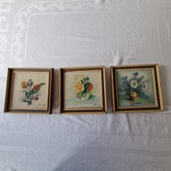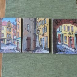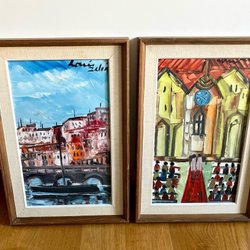 Två tavlor med vackra motiv. En föreställer en byggnad och den andra visar en scen med båtar.konstnär okänd