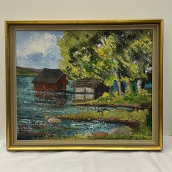 En vacker tavla med ett landskapsmotiv. Det står nere i vänster hörn var denna målning är avbildad från. Den är signerad av konstnären Sten Sandgren. Själva ramen har avskav på sina ställen. Mått: B 81 cm H 60 cm.