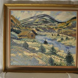 En vacker tavla med ett vintermotiv. Den visar ett landskap med en flod, snö och träd. Tavlan är signerad.
