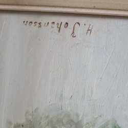 En vacker målning med ett landskapsmotiv. Den visar ett vattendrag med hus i bakgrunden och berg i fjärran.