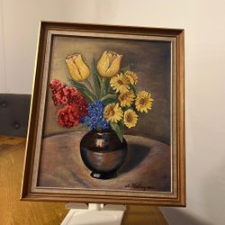 En charmig blomstermålning som föreställer en bukett med prästkragar och klöverblommor. Tavlan har en ljus ram och är redo att hängas upp. Ramstorlek 23/23 cm
