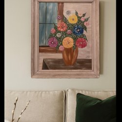 En vacker blomstermålning med en mängd olika blommor i en vas. Målningen är signerad. målning har lite skador då den tappat färg (se bild 4), ramen är i väldigt bra skick
