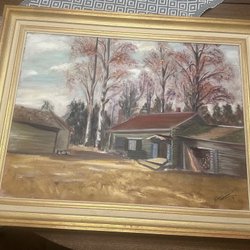 En vacker tavla med motiv av hus i en stadsmiljö. Konstverket är inramat och redo att hängas upp. Oljemålning utav konstnär Lars Nordby.