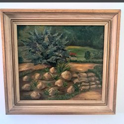 En vacker oljemålning som föreställer ett landskap med vatten och träd. Signerad av konstnären. Baksidan är märkt "MADE IN SWEDEN" och "TREETEX".