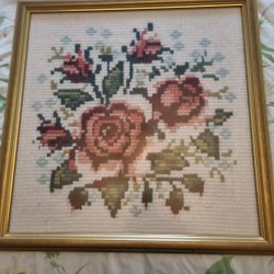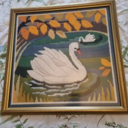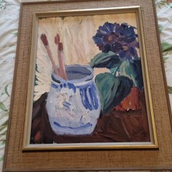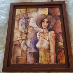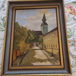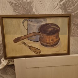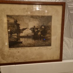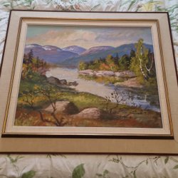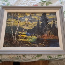 En vacker tavla med ett landskapsmotiv. Den har en guldfärgad ram och är redo att hängas upp.
