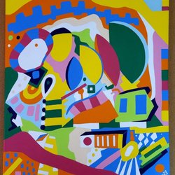 En färgstark och livfull abstrakt målning som fångar blicken. Med sina geometriska former och djärva färgkombinationer skapar den en unik visuell upplevelse. Perfekt för att ge ditt hem en modern och konstnärlig touch. Sätt färg på hemmet!