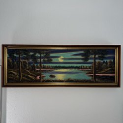 En vacker tavla med landskapsmotiv. Inkluderar belysning. Osäker på om lampan är fungerande.