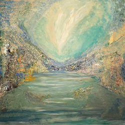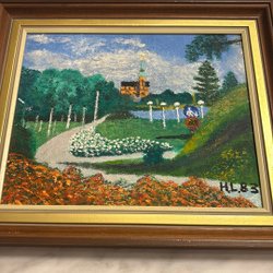 En oljemålning med motiv av ett landskap med berg, skog och en stuga. Signerad och daterad 1953. Mått ca 50x50 cm.