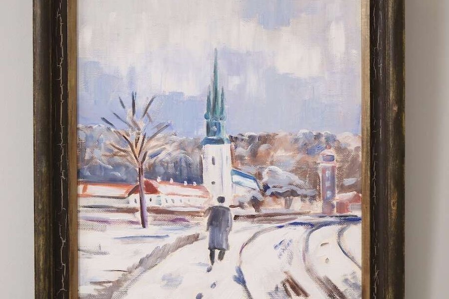 En vacker målning med vintermotiv. Den visar en person som går mot en kyrka i ett snöigt landskap.Albert Jönsson, olja på pannå, 50 x 40
