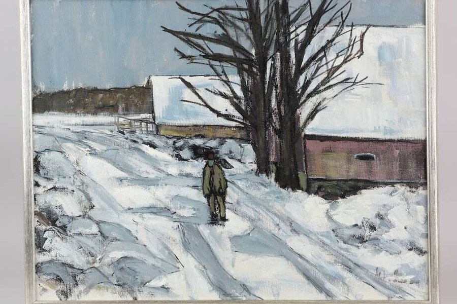 En vacker målning som föreställer ett vinterlandskap med en person som går på en snöig väg. I bakgrunden syns byggnader och ett träd.Oidentifierad konstnär, olja på duk 51x66, otydligt signerad