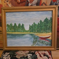 En vacker målning som föreställer ett vinterlandskap med en sjö.