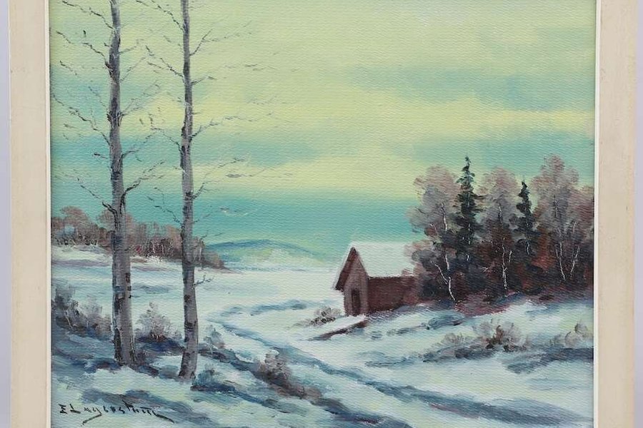 En vacker målning som föreställer ett vinterlandskap med träd och en liten stuga.