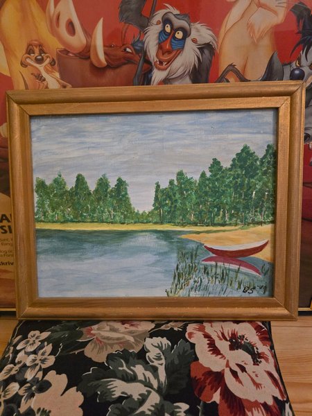 En vacker målning med ett motiv av en sjö och skog. En röd båt ligger vid strandkanten. Signerad 'BS' or 85...