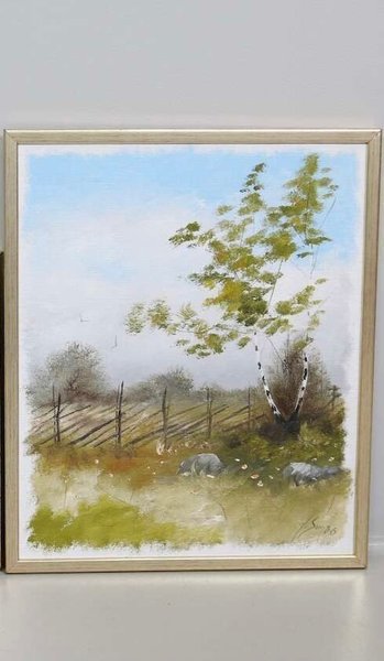 En vacker tavla med motiv av ett landskap. Den har en ljus ram och är signerad '86.Jan-Ingvar Nilsson, olja på duk, 45x38