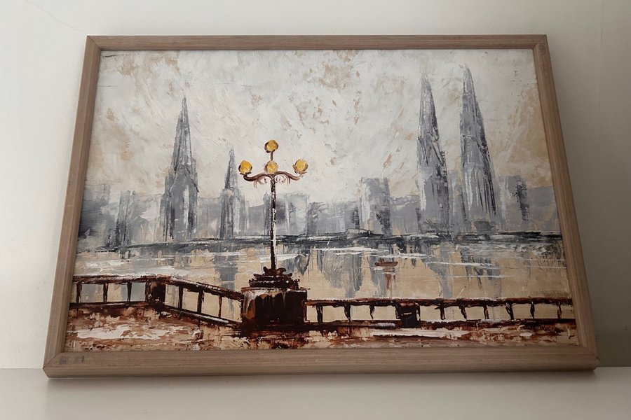 En vacker tavla med motiv av en stadssiluett och en gatlykta. Färgerna är mestadels i gråa och bruna toner, vilket ger ett lugnt och harmoniskt intryck.