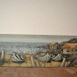 En vacker målning som föreställer ett kustlandskap med en stuga och en båt. Signerad och daterad på baksidan.