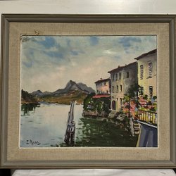 Färgglad tavla med motiv av hus och båtar. Perfekt för att ge ett rum en konstnärlig touch.