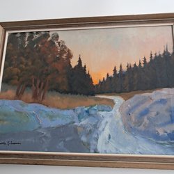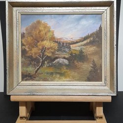 Målad tavla med ett landskapsmotiv. Tavlan föreställer ett landskap med träd, vatten och berg i bakgrunden.