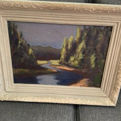 En vacker målning med blommor i en vas. Konstverket är inramat och redo att hängas upp.