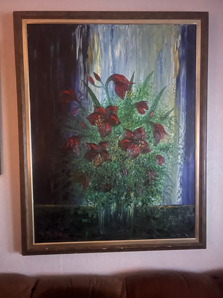 En vacker målning med blommor i vas. Tavlan har en färgstark bakgrund. Den är stor