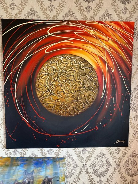 Abstrakt tavla med färgstark design. Den har en cirkel i mitten med textur.l 89 cm b 89 cm