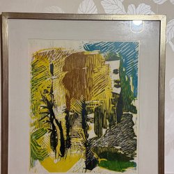 Färgglad tavla med abstrakt motiv. Tavlan har en blandning av varma och kalla färger, med inslag av gult, orange, rött, blått, lila och grönt. Motivet består av organiska former och linjer som flätas samman.