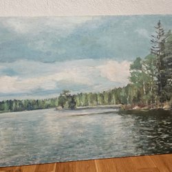 Målad tavla med ett landskapsmotiv. Tavlan är signerad