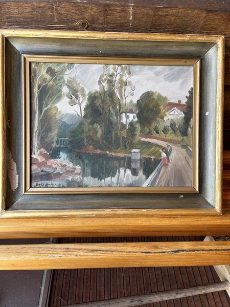 Oljemålning på pannå signerad Axel Andersson, Linköpingskonstnär. Född 1886 död 1956.