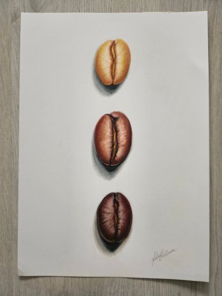 Teckning med tre kaffebönor i olika nyanser. Passar utmärkt att hänga i köket eller matsalen.