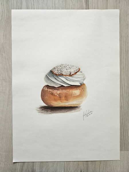 Teckning av en semla på. Perfekt för köket eller matdelen, eller kanske i ett café. Signerad av konstnären med datum