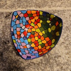 En färgglad målning på duk. Abstrakt motiv med blad. fick den i Schweiz av en vän, ingen aning om denna är värd nåt. men älskar den färgglada bilden.