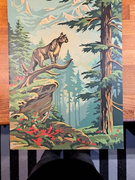 En målning med ett motiv av en puma i en skogsmiljö. Vet ej om det är olja eller nån annan teknik.