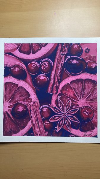 En målning som föreställer apelsiner, kanelstänger, stjärnanis och bär.