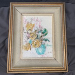 En vacker målning med blommotiv. Den har en upphängningsanordning på baksidan.