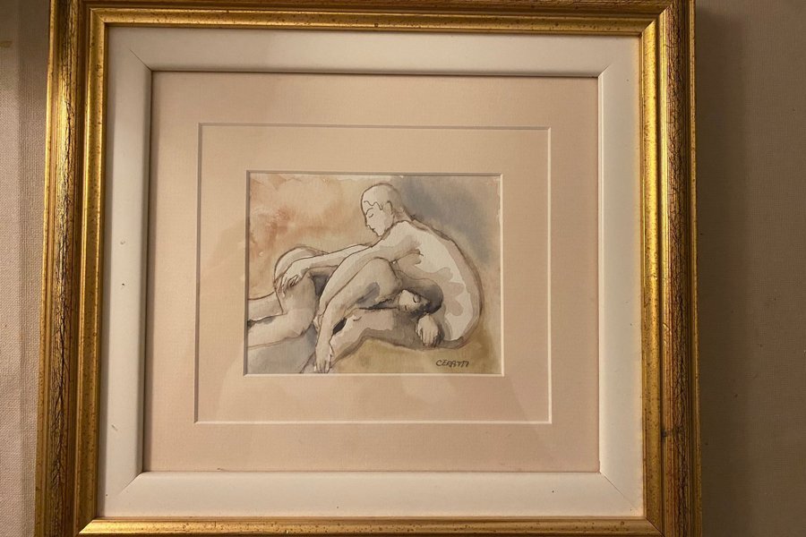 Målad tavla med motiv av två figurer i en omfamning. Tavlan är signerad "CERUTTI".
