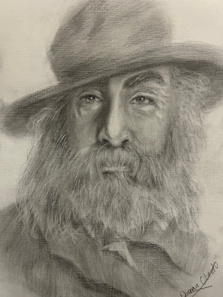 En vacker porträttmålning som föreställer en man med hatt och skägg. Konstverket är utfört i gråskala och fångar mannens karaktär på ett fint sätt.