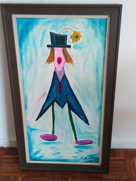 Maleri med motiv af en klovn i hat med blomst. Klovnen har rød næse, blå jakke og lilla sko. Signaturen "CN-78" er synlig nederst til højre. Str. 90x50