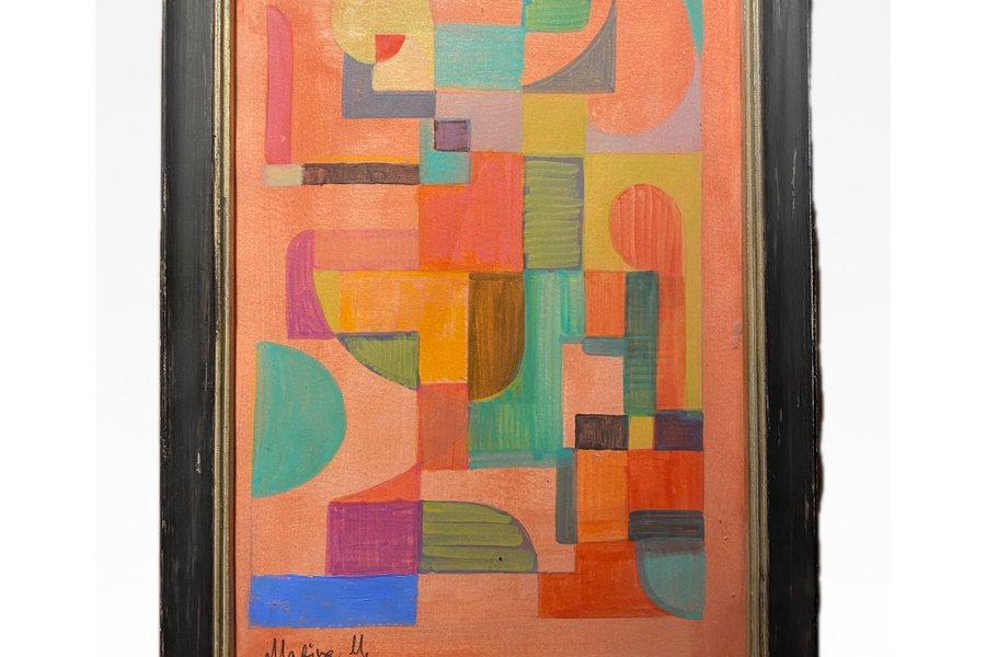 Färgglatt abstrakt konstverk med geometriska former och livfulla färger. Målningen har en signatur i nedre vänstra hörnet. Ca 20•30 cm .