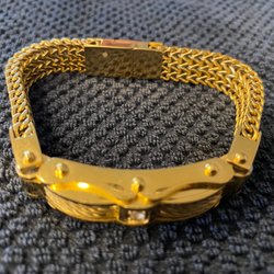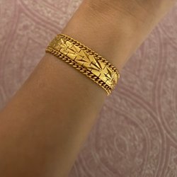 Ett elegant guldfärgat armband med ett unikt mönster. Armbandet har en säkerhetskedja och ett spänne som håller det säkert på plats. Perfekt för att addera en touch av stil till din outfit. Silver guldpläterat