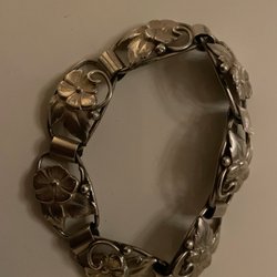 Ett vackert vintage armband i silver. Armbandet har en rektangulär design med en blomsterdekoration inlagd med abalone. Armbandet är stämplat "Mexico". Vikten är 13.86 gram. Innermåttet är ca 64mm.