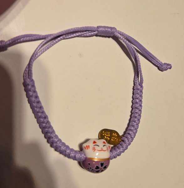 Ett fint lila armband med lycko katt