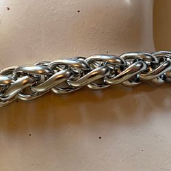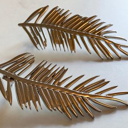 Cirka 3 x 10 cm. Kraftfull, guldfärgad metall i skruvad modell. Genombruten mitt. Broschnål med lås. Begagnad i fint skick. Design CAPRI. Köpt från Edmonton i Canada.