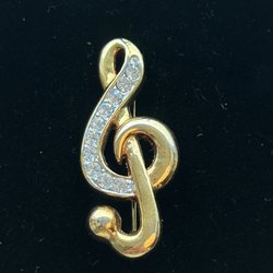 Den här broschen i form av en not i guldfärgad metall är ca 3.5 × 2.5 cm.