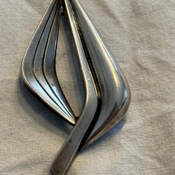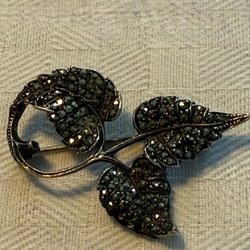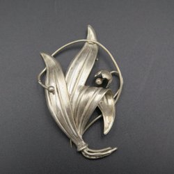 Brosch i form av ett löv. Stämplad med kattfot och 830. Längd 60 mm, bredd 17 mm. Skiftningarna i bilderna beror på skuggor, ingen missfärgning
