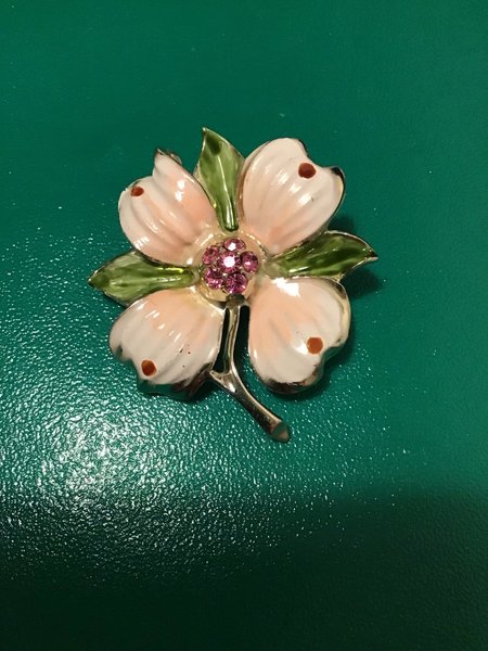 En rosa strass- och emaljbrosch av Coro Jewelry, i början av 1900-tal.
