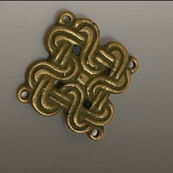 Rund brosch 3,5 cm i omkrets med ett dekorativt mönster runt om. Broschnålen fästs på baksidan och är märkt "Made in Finland"samt Kalevala stämpel. Troligen brons