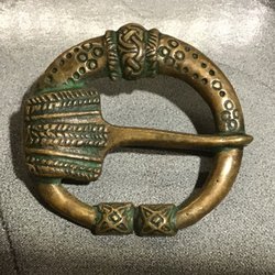 Ett spänne/brosch i mässing tror jag. En kopia på ett vikinga-/medeltidsspänne, mycket fint och billigt.