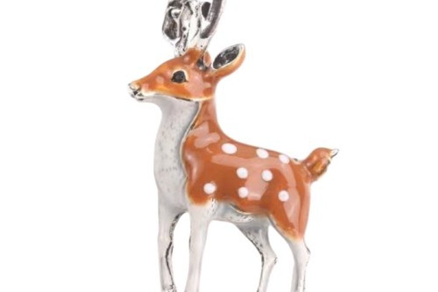 En liten brosch med ett 3D motiv av ett rådjur.