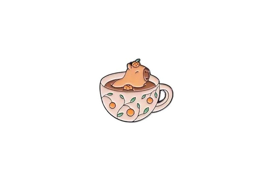 En liten brosch/pin med ett 2D motiv av en kapybara i en kopp/mugg..