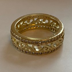 4 x 4 cm. Kraftfull guldfärgad metall. Fint räfflade ytor med inkarvat mönster. Kanterna är släta. Design KRAMER. Nyskick. Broschnål med lås. Köpt från Kanada.